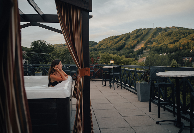 Oui ! Profitez des bains à remous panoramiques été comme hiver, avec vue sur la montagneet la nature environnante des Cantons-de-l’Est.
