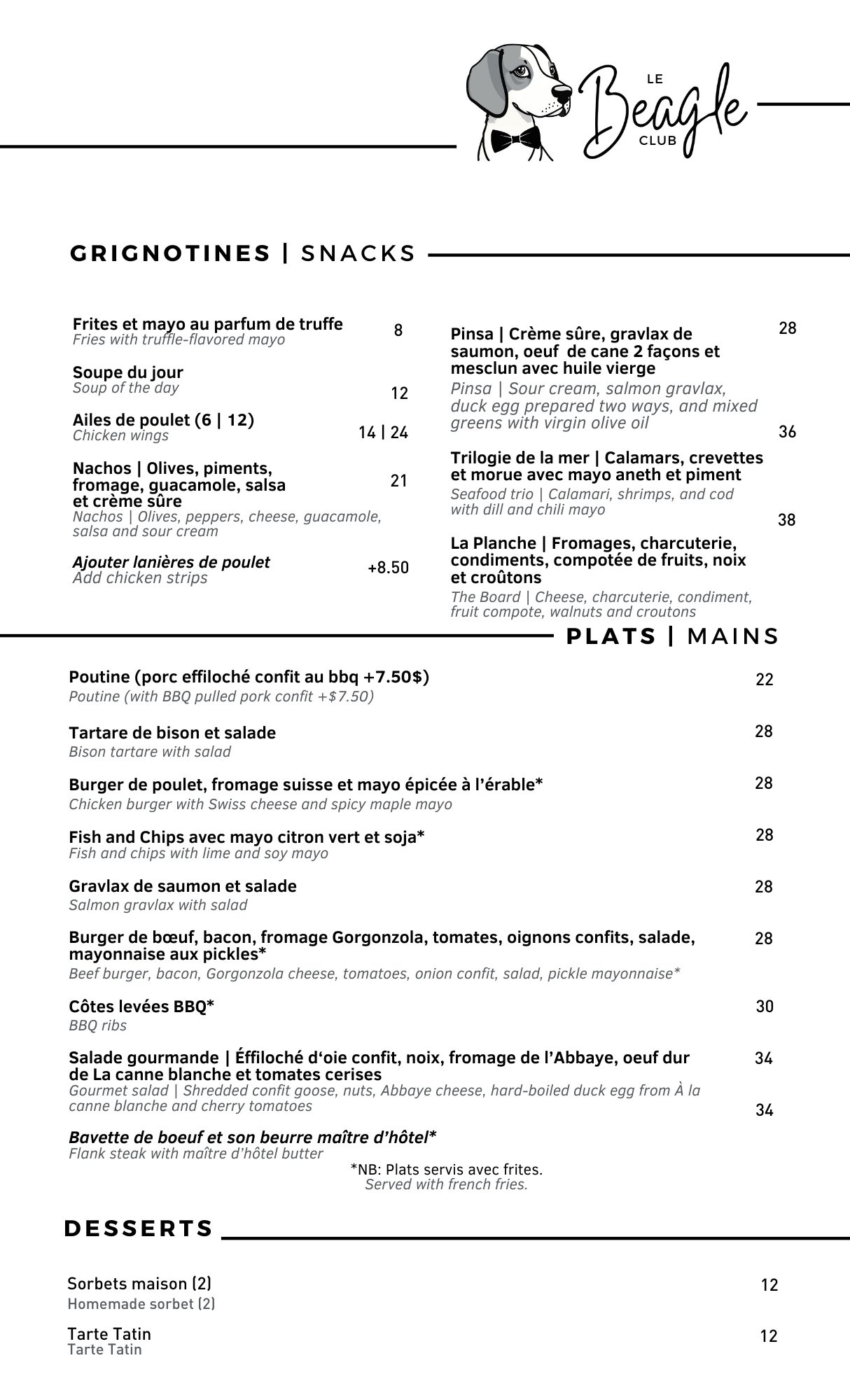 Les jeunes épicuriens de 12 ans et moins ont eux aussi droit à leur festin! Le menu enfant du Beagle Club comprend un plat principal au choix, le dessert et un choix de jus ou liqueur. Un combo gagnant pour profiter pleinement du moment, pendant que les grands savourent leur apéro ou leur assiette.